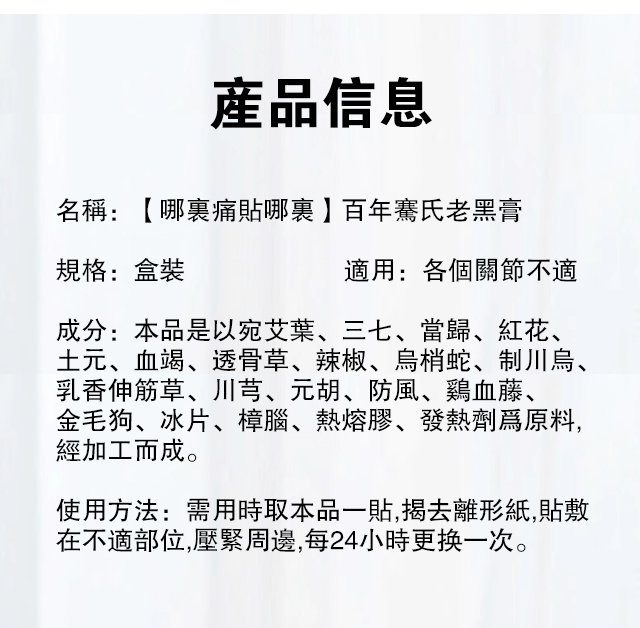 2分鐘前哪里痛貼哪里 百年騫氏老黑膏 火爆熱銷中!台灣本土出貨!24小時在線客服,售後無憂!現在下單享受在線支付立減活動! - 【初步調理 小有成效】20入組 $799